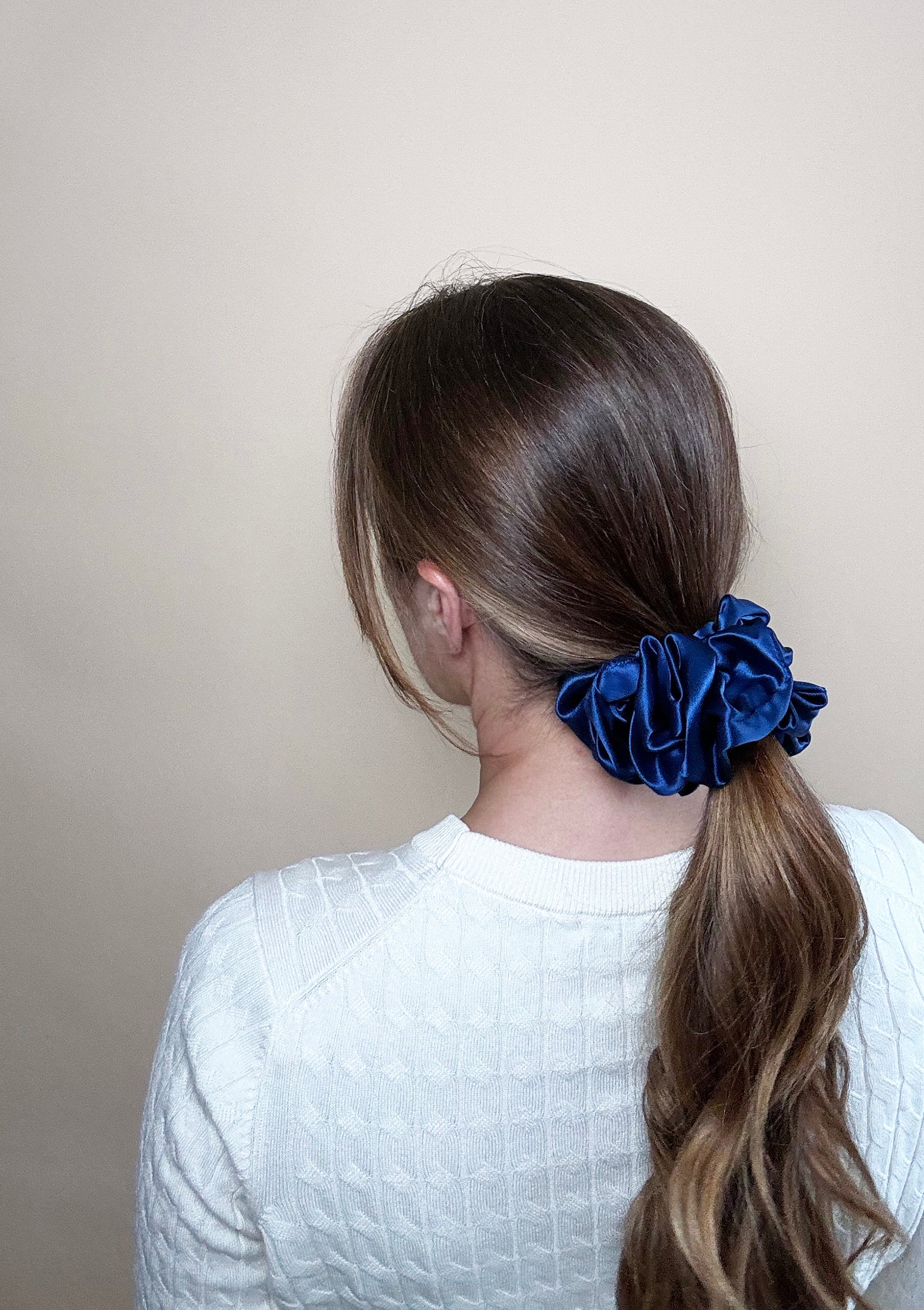Elevate the everyday with our medium 4.5” Navy Silk Scrunchie — pure 19 momme charmeuse mulberry silk for a soft, light-reflective finish and beautiful hold. Comes beautifully presented in our branded pouch and card.