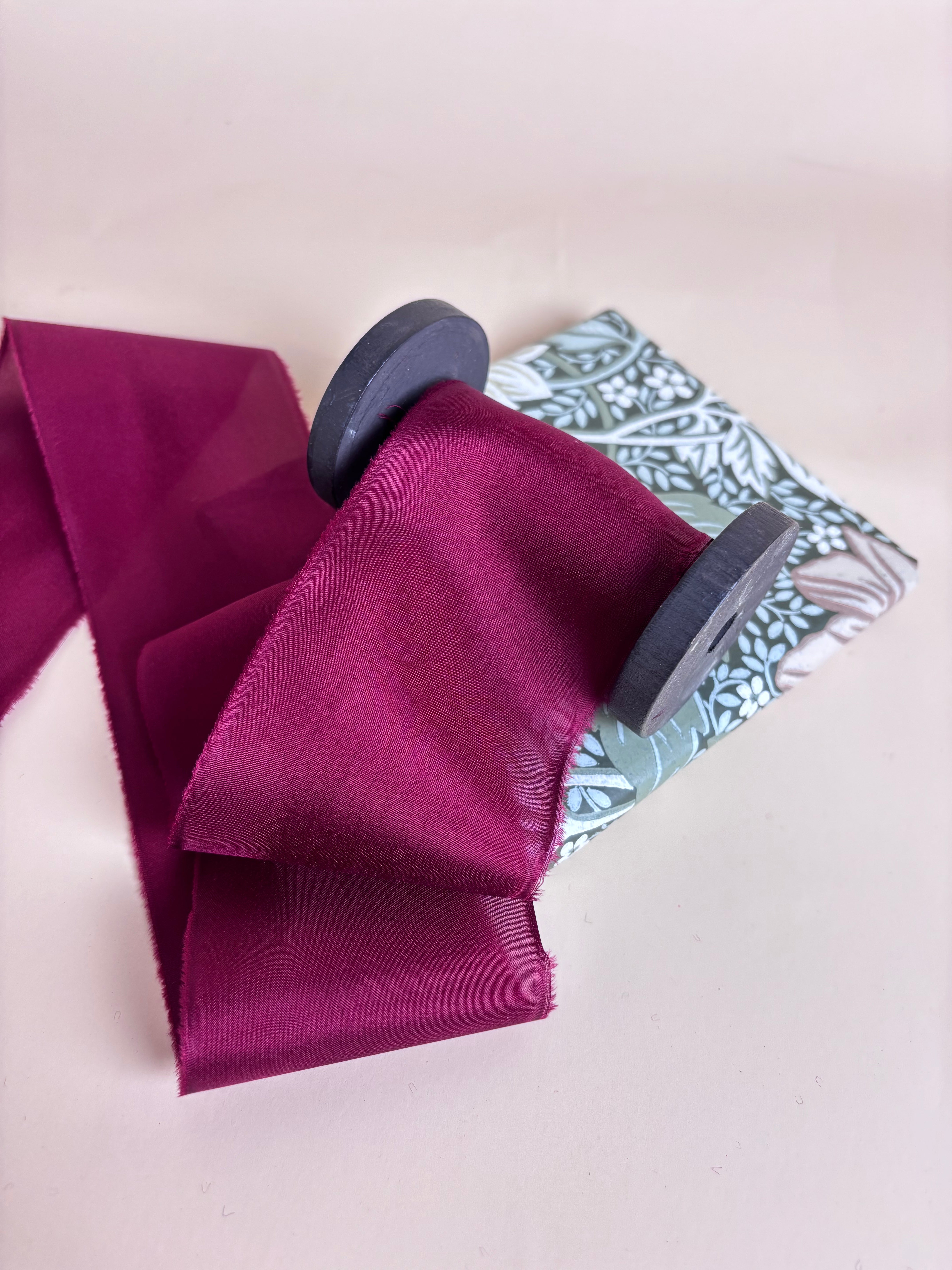 Designed for Christmas wreaths, garlands, wedding bouquet ribbons, luxury gift wrapping, fine art stationery, floral arrangements, and creative projects, this silk ribbon features a hand-torn, frayed edge, offering an organic, heirloom-quality finish. Each ribbon is presented on a wooden dowel as standard, with the option to upgrade to a keepsake spool for an elevated touch.